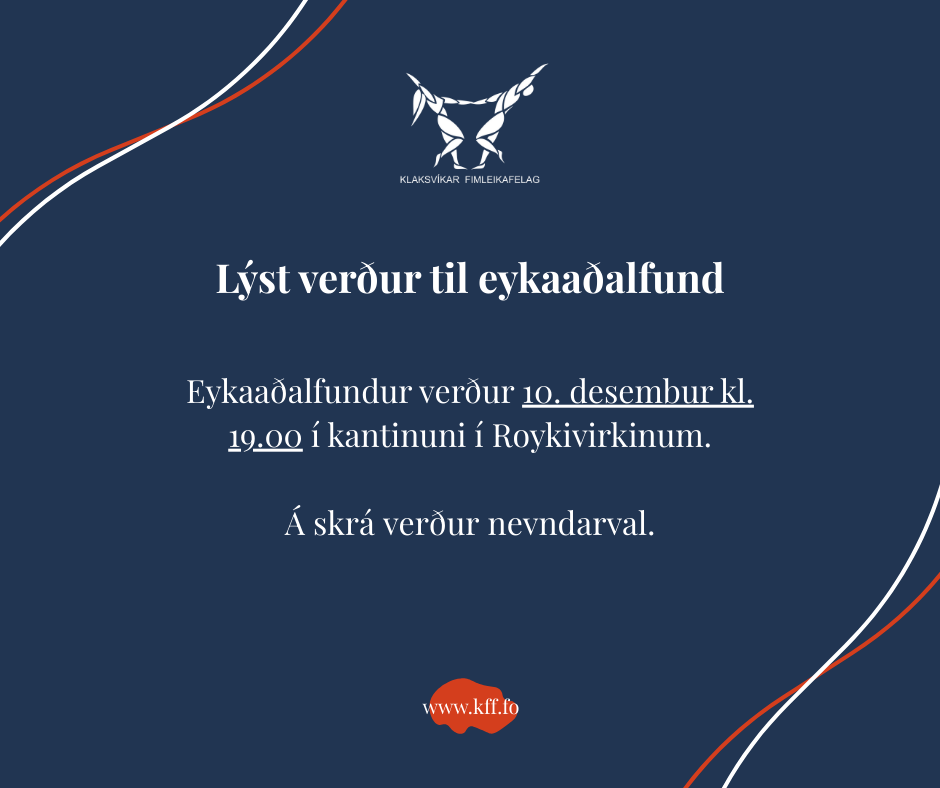 Ársaðalfundur var 26. novembur í Roykivirkinum. Tíverri eydnaðist ikki at mannað nevndina, lýst verður tí til eykaaðalfund 10. desembur kl 19.00 í kantinuni í Roykivirkinum. Á skrá verður nevndarval. Vit vóna at nógv fólk møta upp.